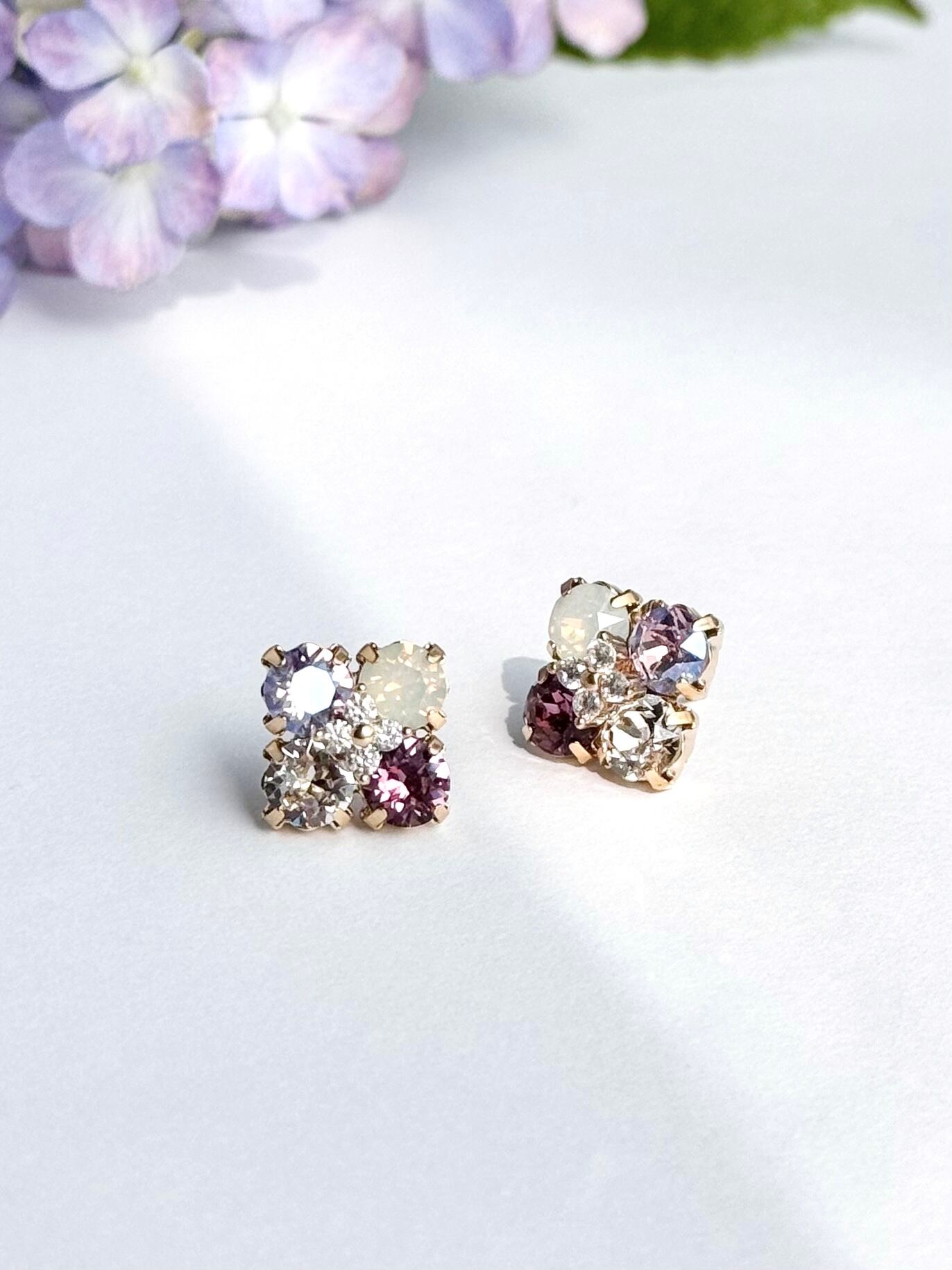 紫陽花カラーのスクエア型ビジューピアス