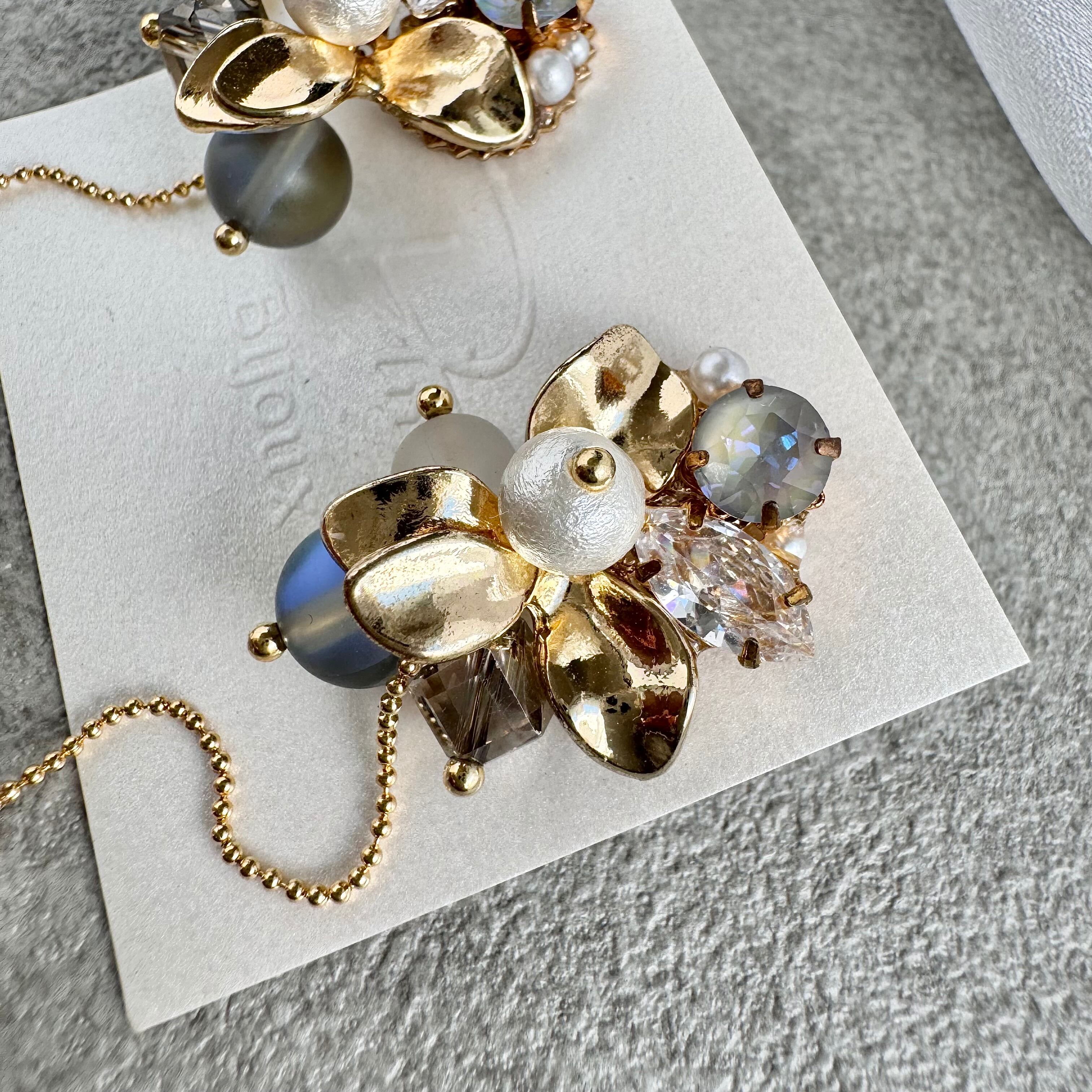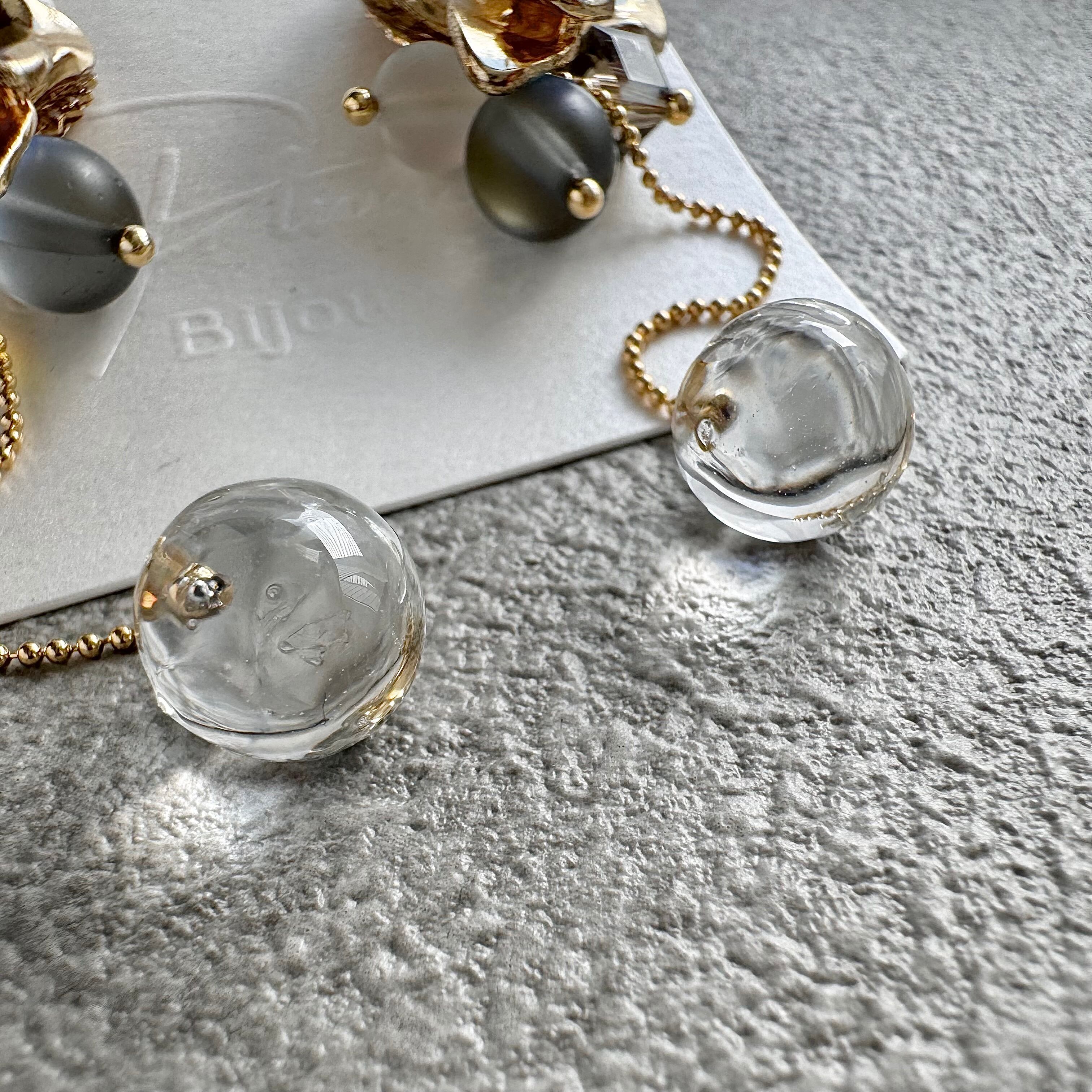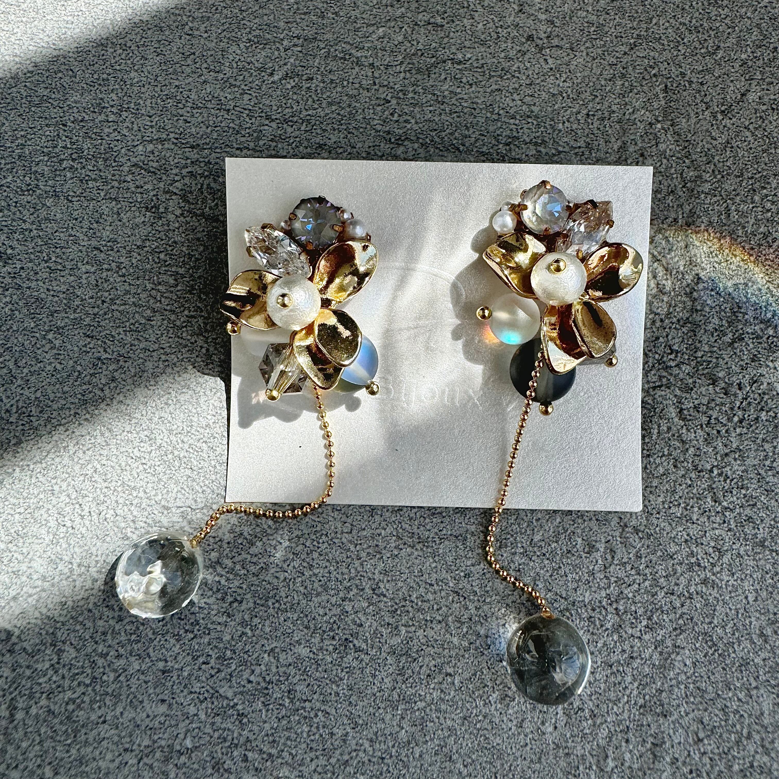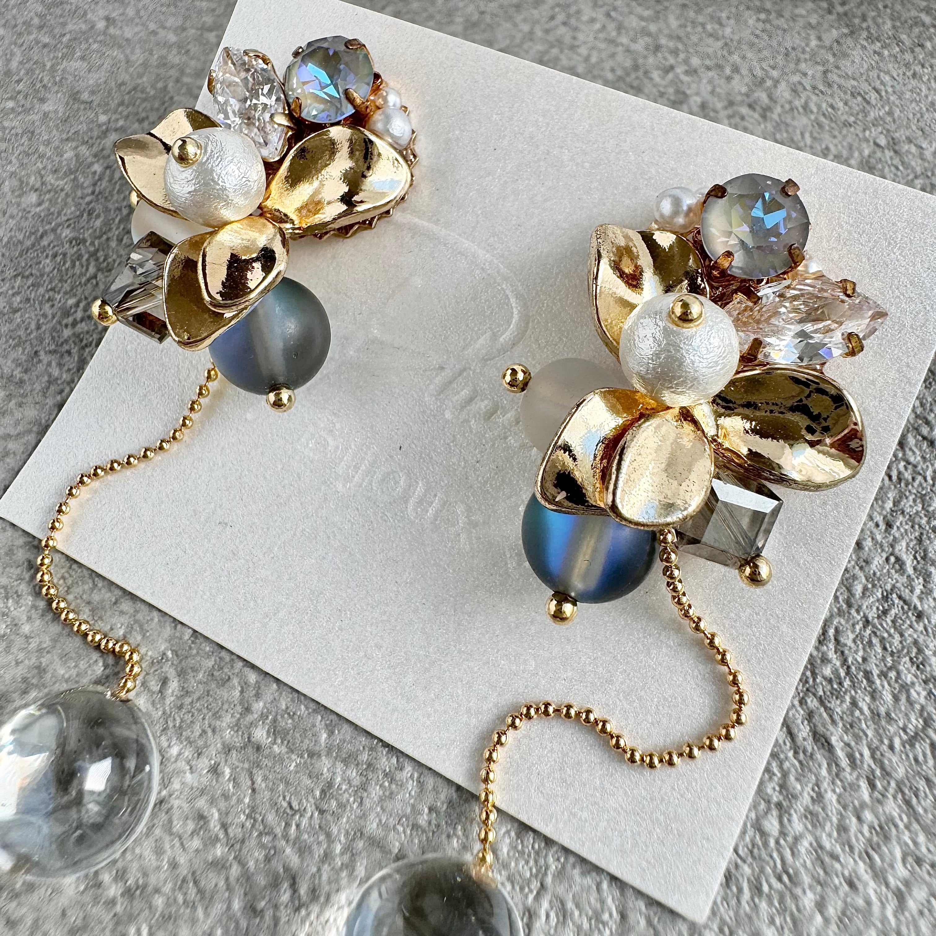 角度によってブルーみがかったカラーのクリスタルガラスとトップのビーズは幻想的な輝きを放ってくれます。